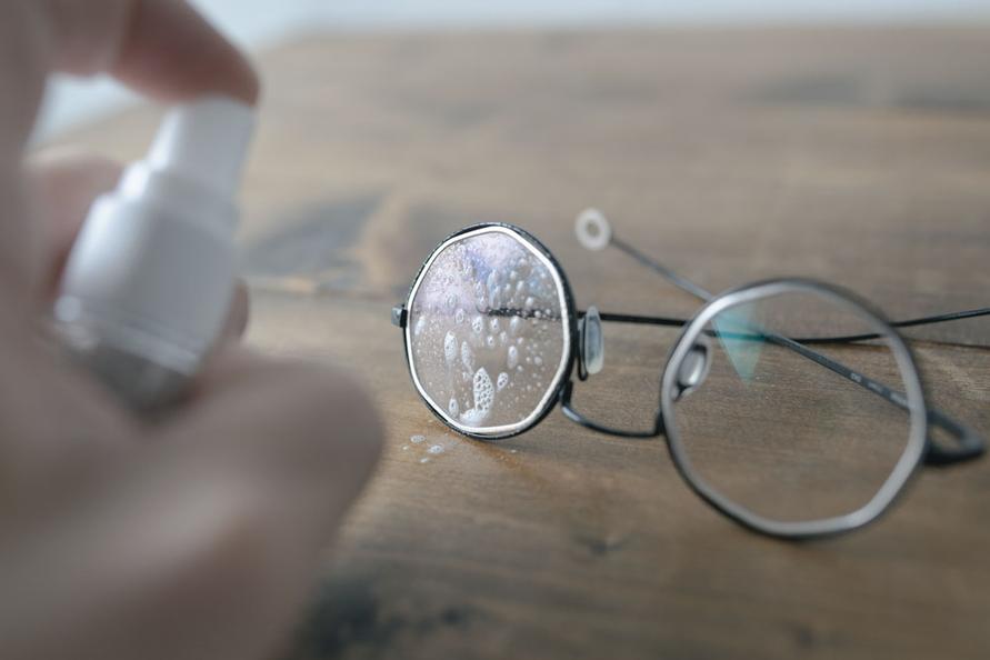 まずはメガネのレンズの裏表にシュッとクリーナーを吹きかけます。