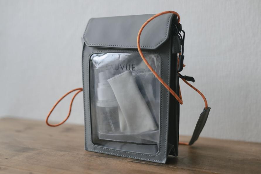 クリアでスタイリッシュなポーチに、液体のクリーナーと布製のクリーナーが入っています。