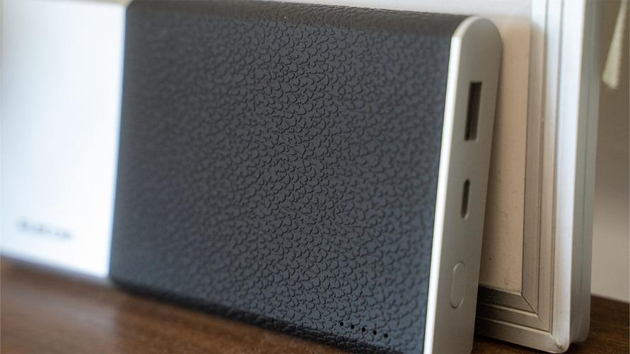 シンプルな手帳サイズのモバイルバッテリーで、光沢感を抑えたアルミのボディの一部をレザー調のプラスチックパーツが覆っています。