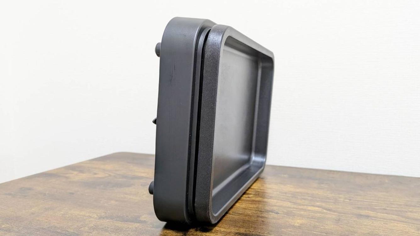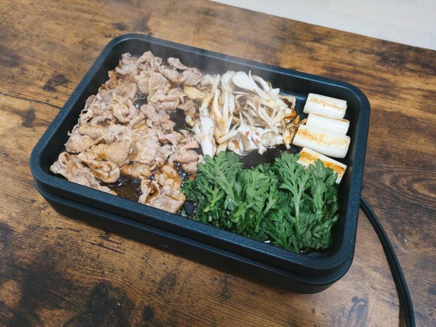 本体にくっついているプレートは、深さ約2cm! 鍋やおでんとまではいきませんが、少し汁気のある料理もOKです。私がひとりすき焼きをしたときは、50mlのタレを入れましたがまったく問題なし。もんじゃ焼きもよさそうです。
