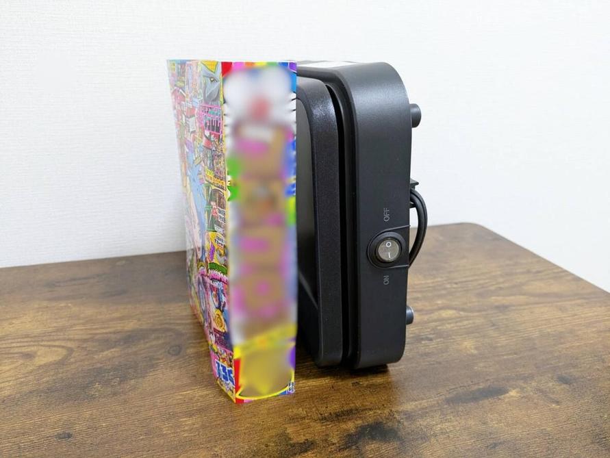 立てるとこんな感じです。月刊漫画雑誌約2冊分の厚みがあります。不安定な場所に置いたり、意図的に押さなければ倒れません! しっかり立ちます。
