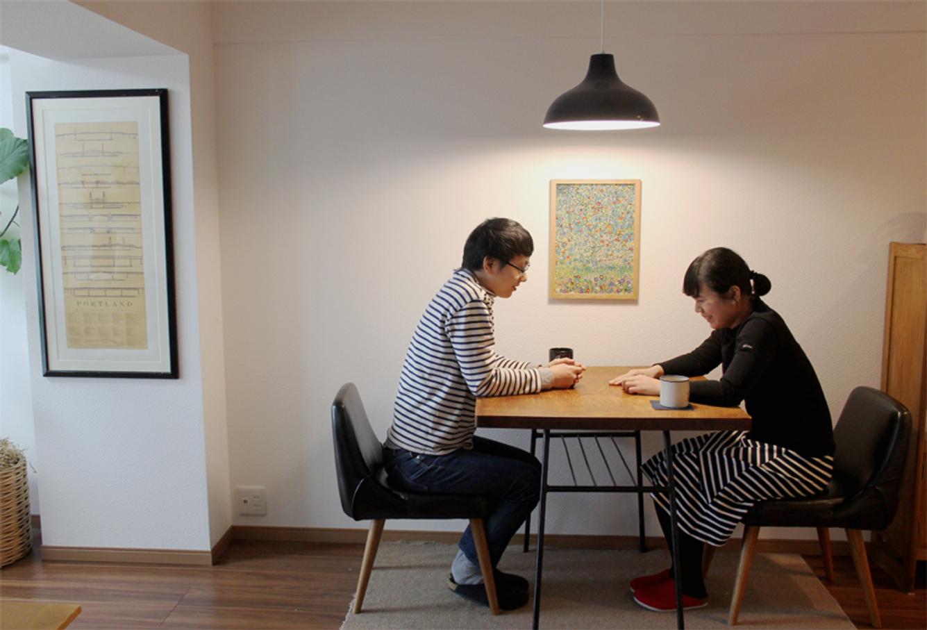 ふたりが一番気に入っている場所。食事はもちろん、千恵さんはここで仕事をすることも多いそう。ダイニングテーブルは西荻窪の家具屋「アンティーク慈光」で出会ったビンテージもの。