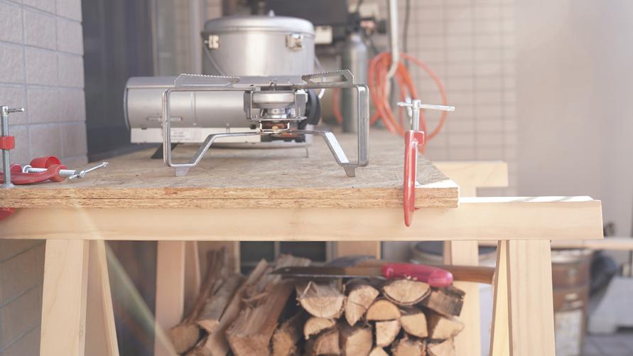 薪などを筆頭に、どうしてもアウトドア専用になってしまうモノは基本ベランダに置いていますが、ここをただの物置きにはしたくはないので、薪棚にOSB板を渡してテーブルをDIY。
