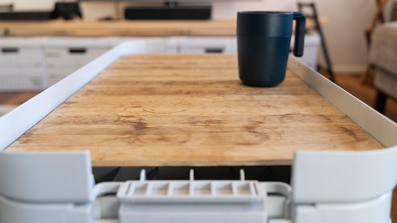 モノも置けて作業もできるワークスペースにしています。ランタンやバーナー、斧のメンテナンスなんかもここでやっちゃえるので合理的。