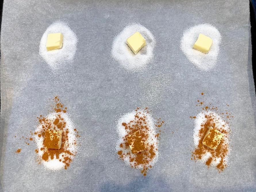 3. 2に6等分したバターをひとつずつのせる。好みでシナモンパウダーを振りかける(今回は3つだけシナモンの風味を効かせました)。