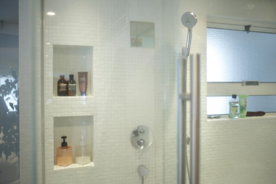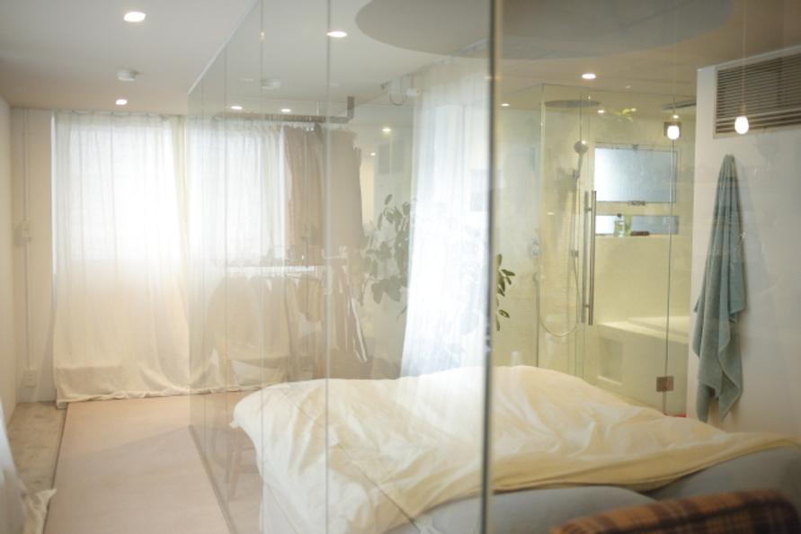 バスルームもガラス張りで、ベッドルームと繋がりがあるようになってます。新しく収納を買わなくて済むよう、壁をくりぬいた収納がこだわりです。