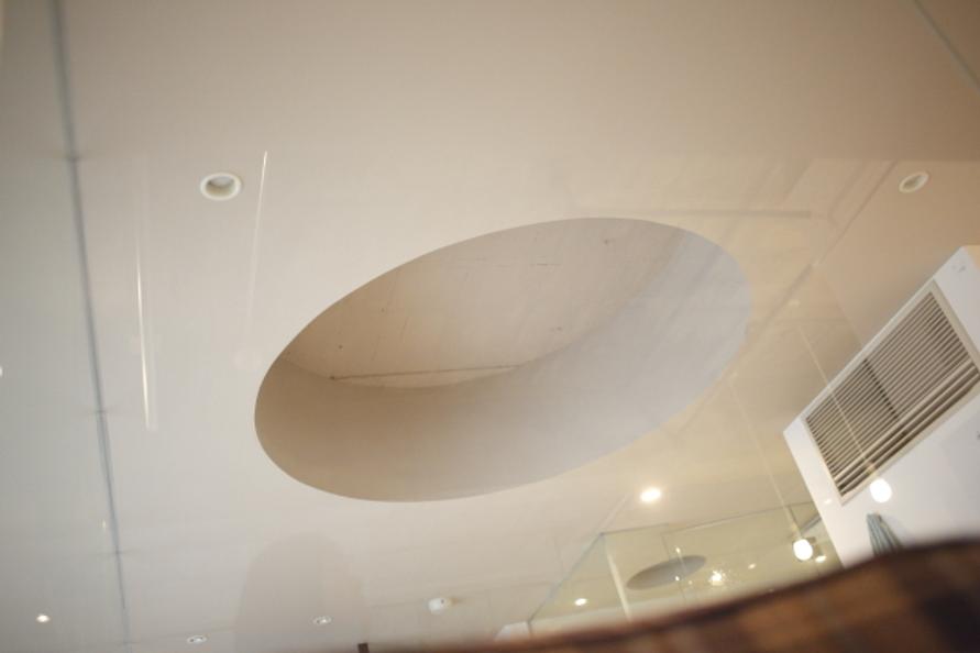 天井の穴は、建築家さんのこだわりなんですけど、もともと寝室とリビングの間にある梁(はり)がかなり大きくて、むき出しにすると梁の出っ張りが目立ちすぎてしまうんです。そこで、この梁の高さに合わせて、あえて寝室の天井を少し低くしました。そうすると横になった時に閉塞感が出てしまうので、目線に奥行きが出るよう、頭の上に丸い穴を開けたんです。目線が抜ける感じで、いいですよ。