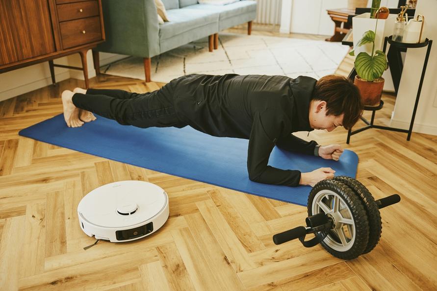 トレーニングシーンでも「MOVA P50 Ultra」は大活躍。運動の合間に部屋の掃除を任せられるのはもちろん、床に落ちてしまった汗も水拭きしてくれて、さっぱりと清潔な床をキープ!