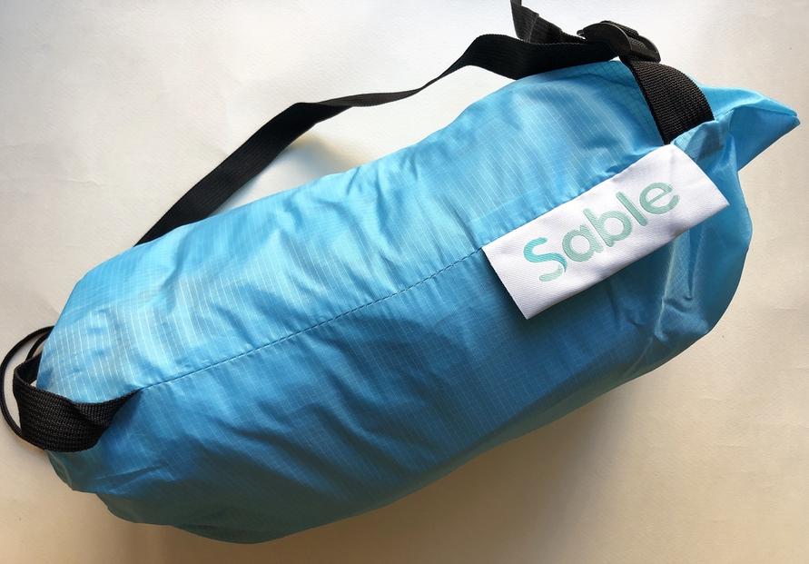 一見プールバッグのような見た目の収納袋。その中に折りたたまれた本体が入っている、Sableのエアソファ!