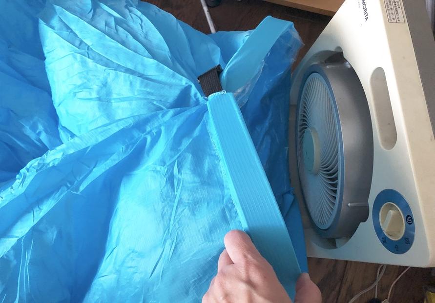 インドアで使う場合は、広げると結構な大きさになる本体を振り回して空気を入れるのは至難の業……。(屋内なら扇風機やサーキュレーターで膨らませるのが良いです)
