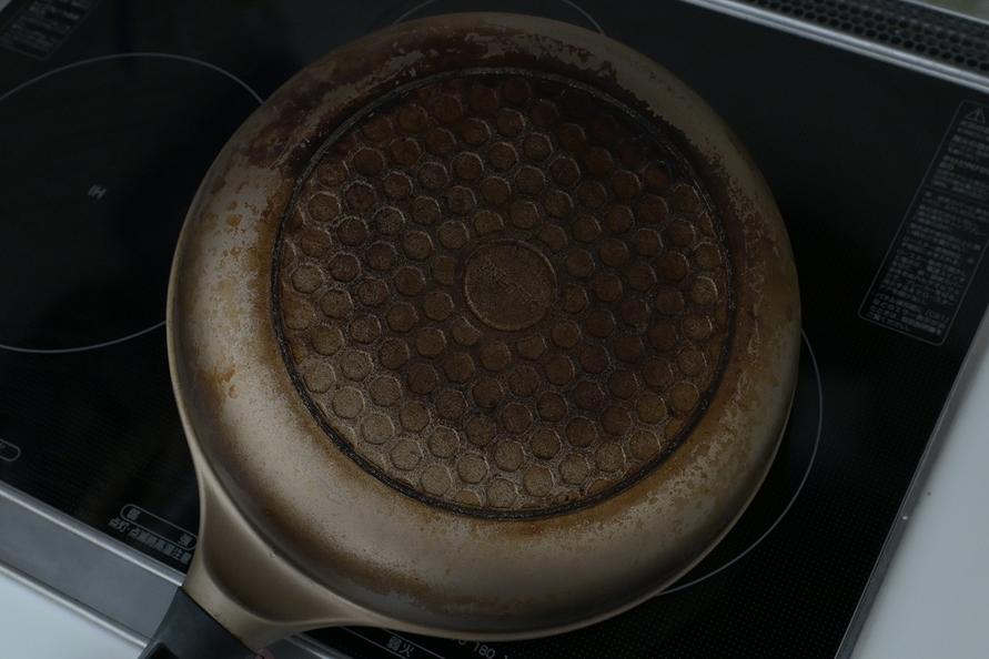 流石に長年使っているフライパン、もう炭化してしまっていたのか、底の部分のコゲはかなり残ったまま……。