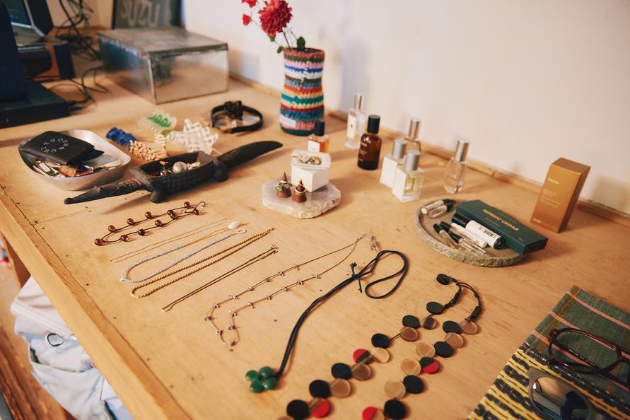 前回の記事でも紹介した、扉を取っ払った押し入れ。中には2人のアクセサリーやバッグなど、多種多様なアイテムが並べられています。