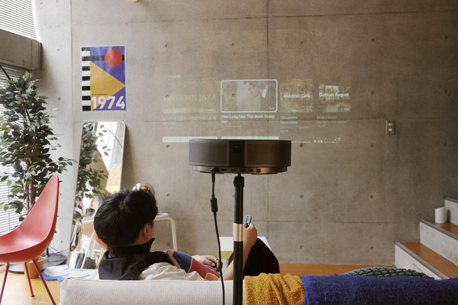 Masashiさんの暮らすお部屋は、スッと上まで伸びた高い天井が特徴。それを最大限活かせるよう、部屋を狭く見せない工夫をしているとのこと。それはテレビを置かず、代わりにプロジェクターを使うこと。