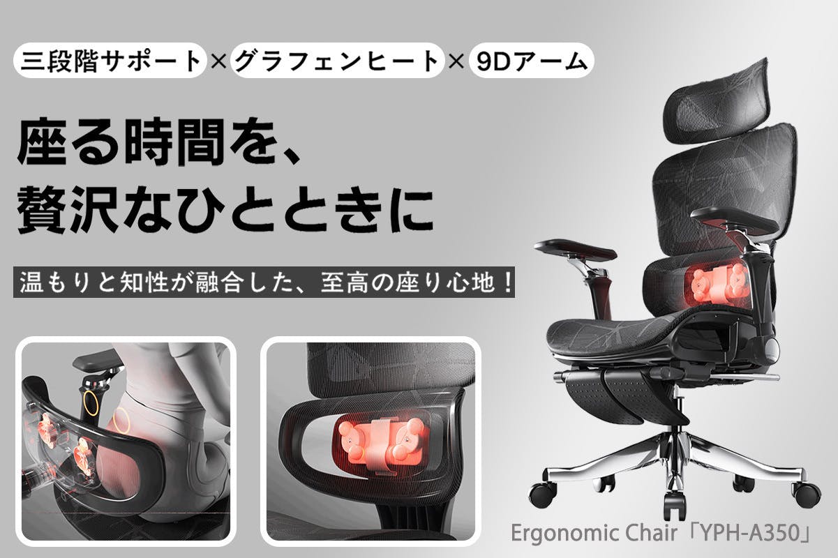 次世代ワークチェア「YPH-A350」が登場。グラフェン遠赤外線ヒーターと振動機能を搭載し、座っているときの心地よさをサポートするという意欲作です。