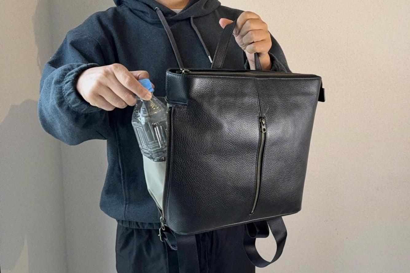 >>【三面稼働構造】前・横・背面すべてが機能する。撥水レザーの完成形リュック、誕生!