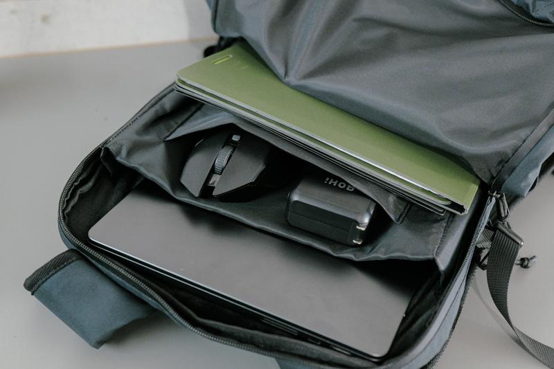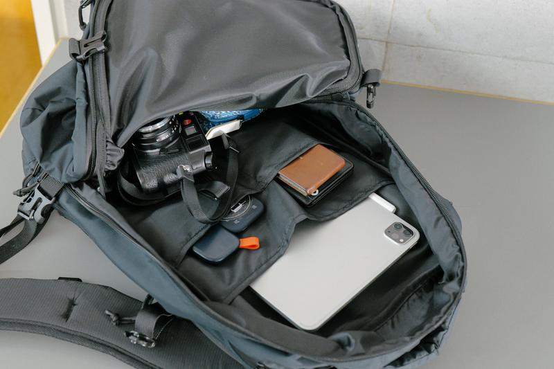 収納機能は今どき定番の構成で、ガジェットたちとの相性もグッド。メインスペースはしっかり広く、iPadやカメラ、SSDなどの小物類も整理しながら収納できました。