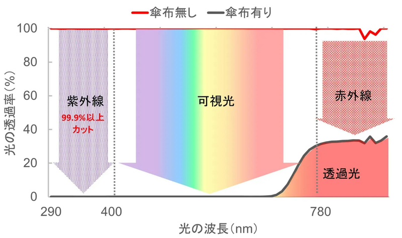 紫外線は99.9%以上カット。遮光はされていないので完全な日傘にはなりませんが、日焼け対策はできそうですね。