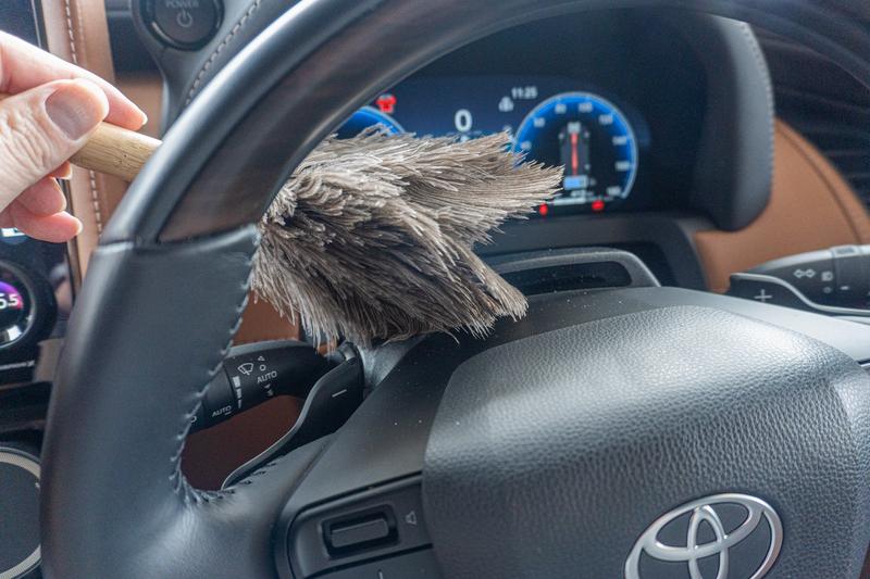 車のダッシュボードやハンドル、シフトノブ周りもホコリが目立つポイント。造形が複雑なことが多いものの、たっぷり羽毛で掃除しやすかったです。