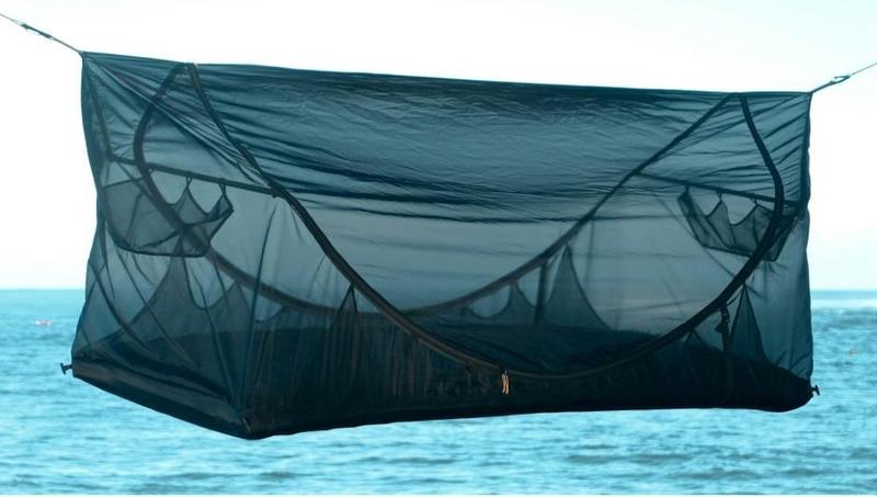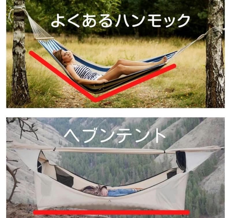 一般的なハンモックは包まれ感と引き換えに身体が沈み込んで腰が痛くなることも多いですが、「ヘブンテント」はいつものベッドに近い水平姿勢で休めるのが特長ですよ。
