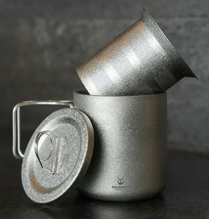 machi-yaに登場したのは、チタンを得意とするアウトドアブランドsilver Ant(シルバーアント)の「結晶化チタンマグ」。名前のとおり純チタンを結晶化させ、見た目・耐久性・機能が三拍子揃ったマグなんです。フルチタンな茶漉しまで付属するから、お茶もコーヒーもこれひとつで淹れられますよ。