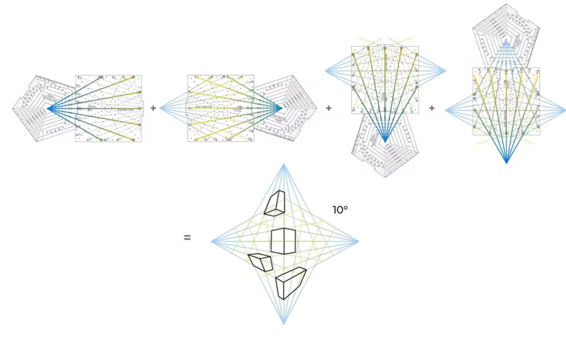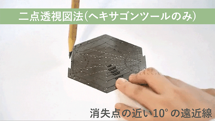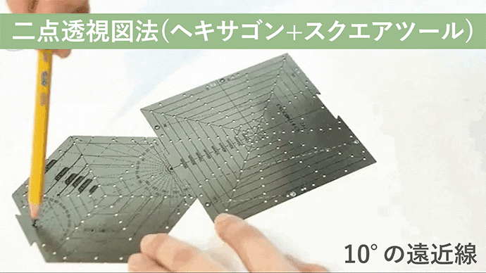 例えば、ペンタゴンツールとスクエアツールを組み合わせると5度+10度刻みの二点透視図法を描くことができたり、