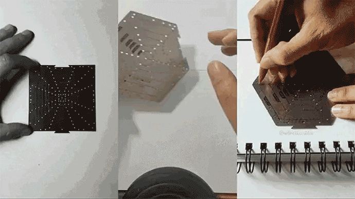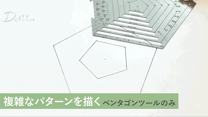 主な使い方は各ツールの形状を活かしつつ、直線と角度を決めて結んでいく感じ。工夫次第で多様なデザインや複雑な幾何学模様まで作図が可能になります。