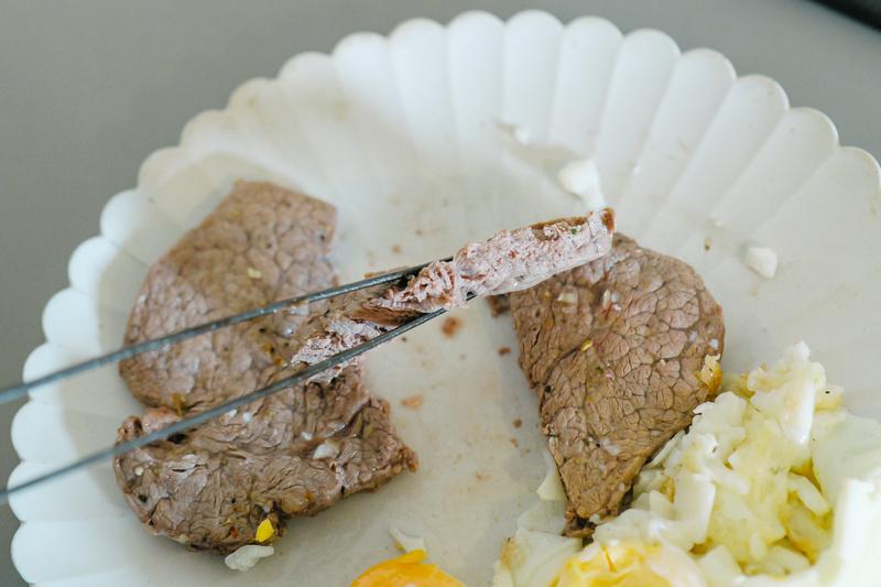 意外だったのがステーキの調理加減。割引品のステーキ肉にも関わらず、かなり柔らかく噛み切りやすいステーキが完成しました。