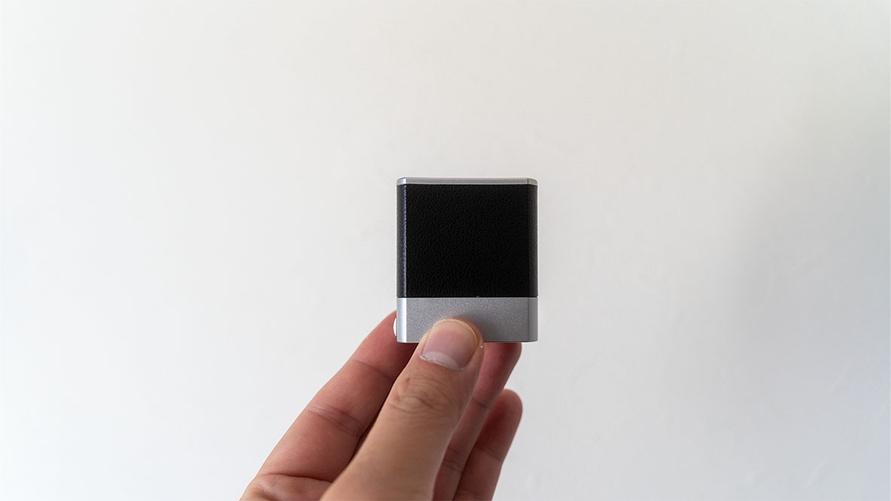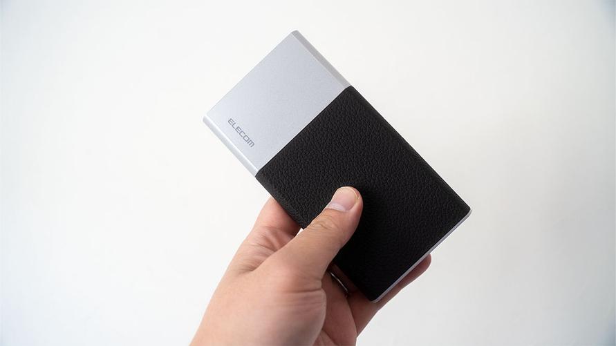シンプルな手帳サイズのモバイルバッテリーで、光沢感を抑えたアルミのボディの一部をレザー調のプラスチックパーツが覆っています。