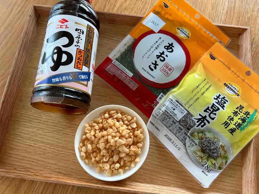 塩昆布がなければ、天かすとあおさだけでもOK。