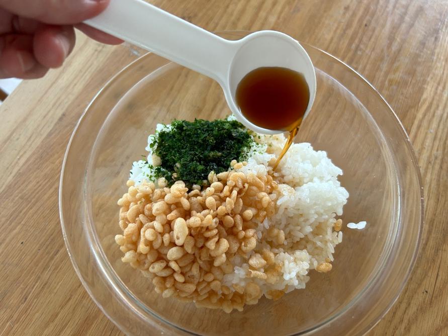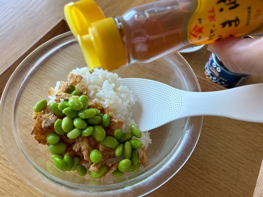1.たきたてのごはんに天かす、青のりをかけ、めんつゆを加えます。全体に行きわたるように回してかけるのがポイントです。