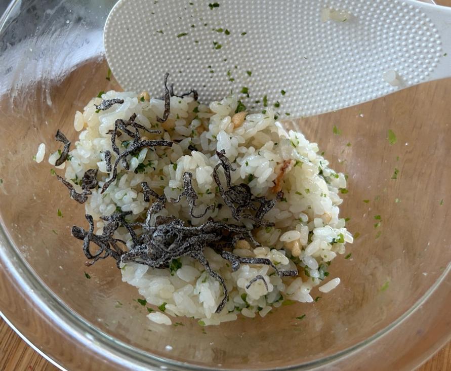 2. 今回はここに塩昆布を加え、さっくりとまぜます。