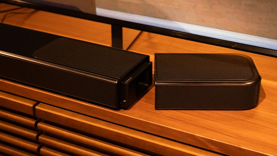 なんとサウンドバー本体の両端を取り外して、リアスピーカーとして自由に設置することができるんです!