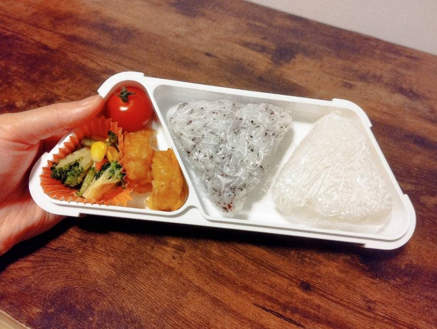 中仕切りやおにぎり型をうまく使えば、いろいろな詰め方ができるのもいいですね。三角のスペースには、冷凍のお惣菜、チキンナゲット、ミニトマトが入りました。私はおにぎり2個とおかずの、この入れ方がお気に入りです。