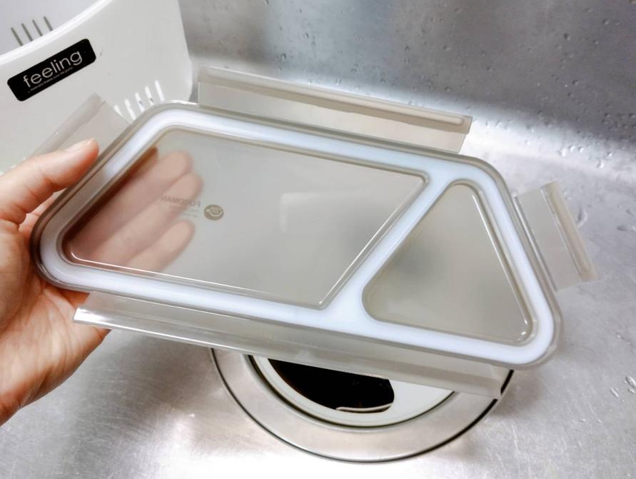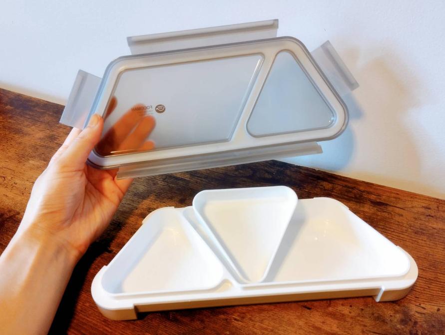 お弁当箱のパーツは、フタ、本体、おにぎり型の3つだけです。フタについているパッキンは一体型なので、フタとパッキンの間に汚れが入りにくいのがありがたい……。洗うときに、わざわざ外さなくていいのもうれしいですね~。