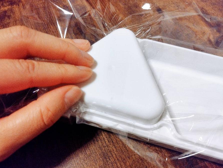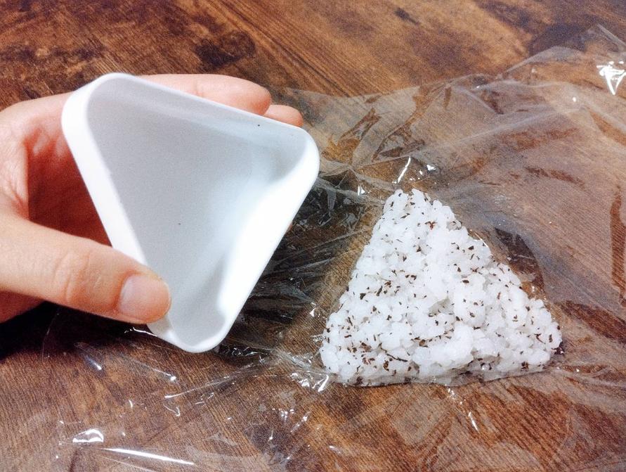 三角のスペースでは、カンタンにおにぎりがつくれます! まずラップをしいて、その上にごはんをのせます。