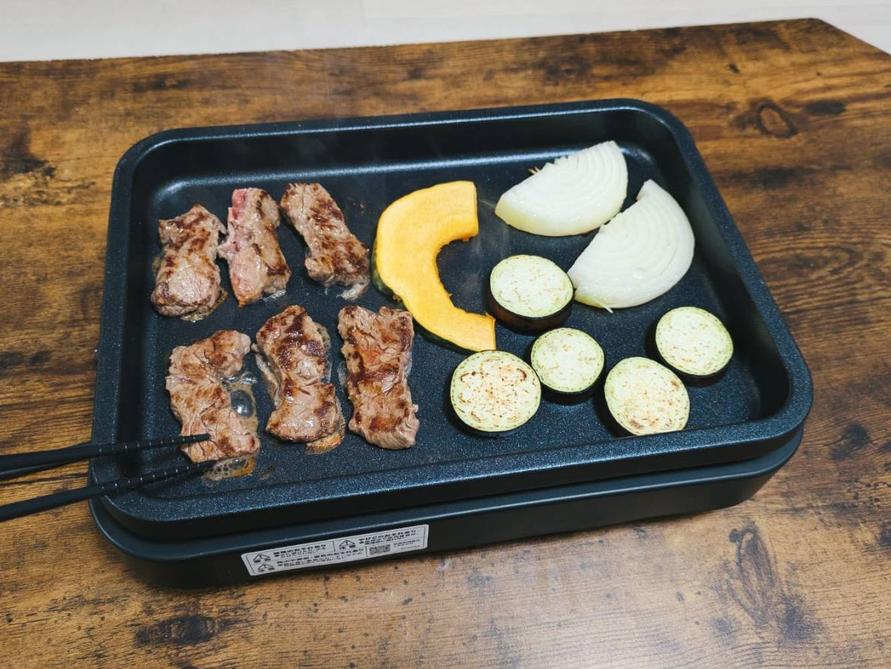 スイッチはオンオフのみです。約3分で適温になったら焼肉スタート! ただ、つくる料理によっては、もっと早く焼きはじめてもいいかもしれません。フレンチトーストをつくったときは、約2分の予熱で十分でした。慣れが必要かも。
