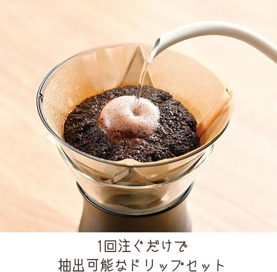 本商品は、“はじめての一杯”をおいしくするためのコーヒー器具です。最大の特長は、蒸らし不要の「一回抽出」構造。ドリップで面倒になりがちな工程を省き、お湯を注ぐだけで抽出が完了します。
