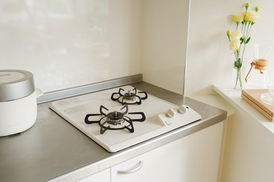 お気に入りは、2口の白いコンロ。見た目にかわいく白い家電にもなじみ、白いことで汚れが目立つからかえって掃除もしやすいのだそう。