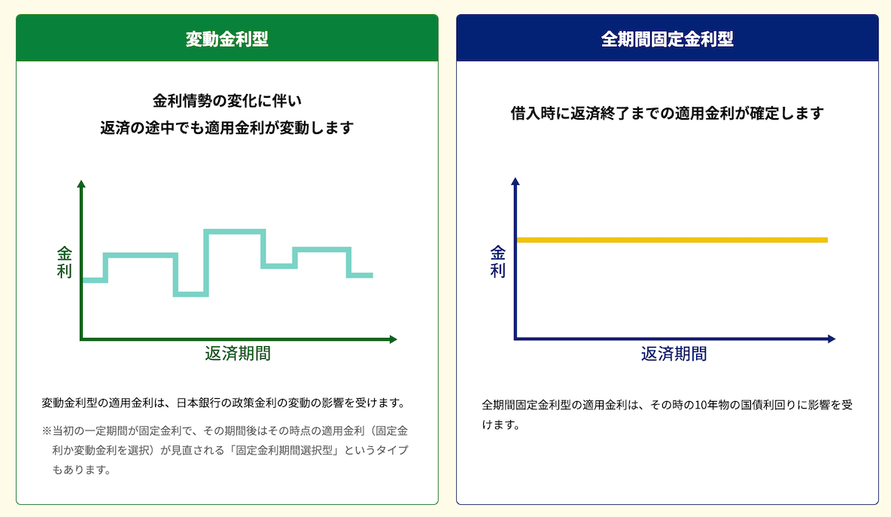 とくに金額の大きい住宅ローンは、金利の影響をもっとも受けやすいローン。住宅ローンには「変動金利型」と「固定金利型」のタイプがあり、金利は変動金利型のほうが低く設定されていますが、名前のとおり、返済中に金利が変わります。一方で、固定金利型は変動金利型よりも金利が高く設定されていますが、借りたときの金利が完済まで変わらないという特徴があります。