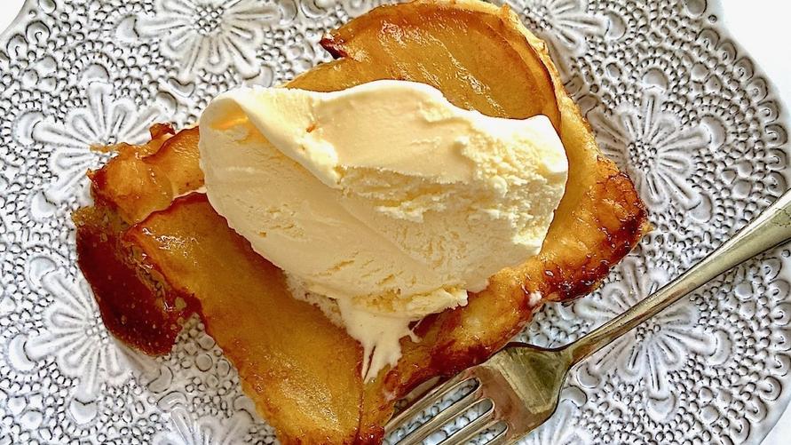 7. 焼き上がって粗熱が取れたら、オーブンシートを剥がすようにそっとひっくり返し、りんごの面を上にする。好みでバニラアイスクリームをのせても。