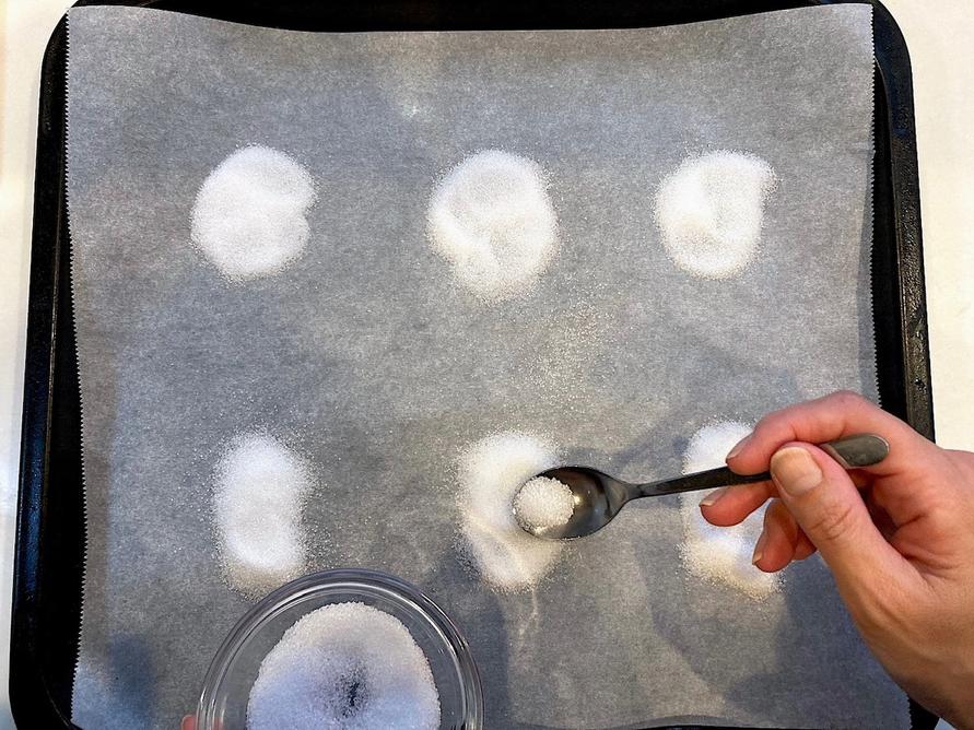 2. オーブンの天板にオーブンシートを敷き、ティースプーン1杯分のグラニュー糖を丸く広げる(個数分)。