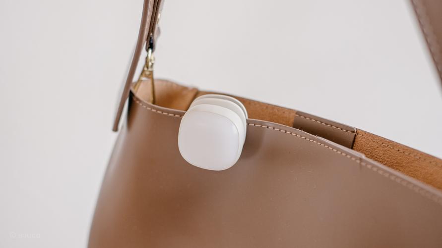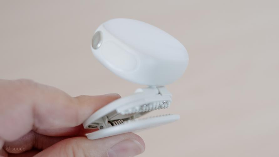 クリップタイプになっていて、バッグの持ち手やポケットのふちに挟むだけでOK。