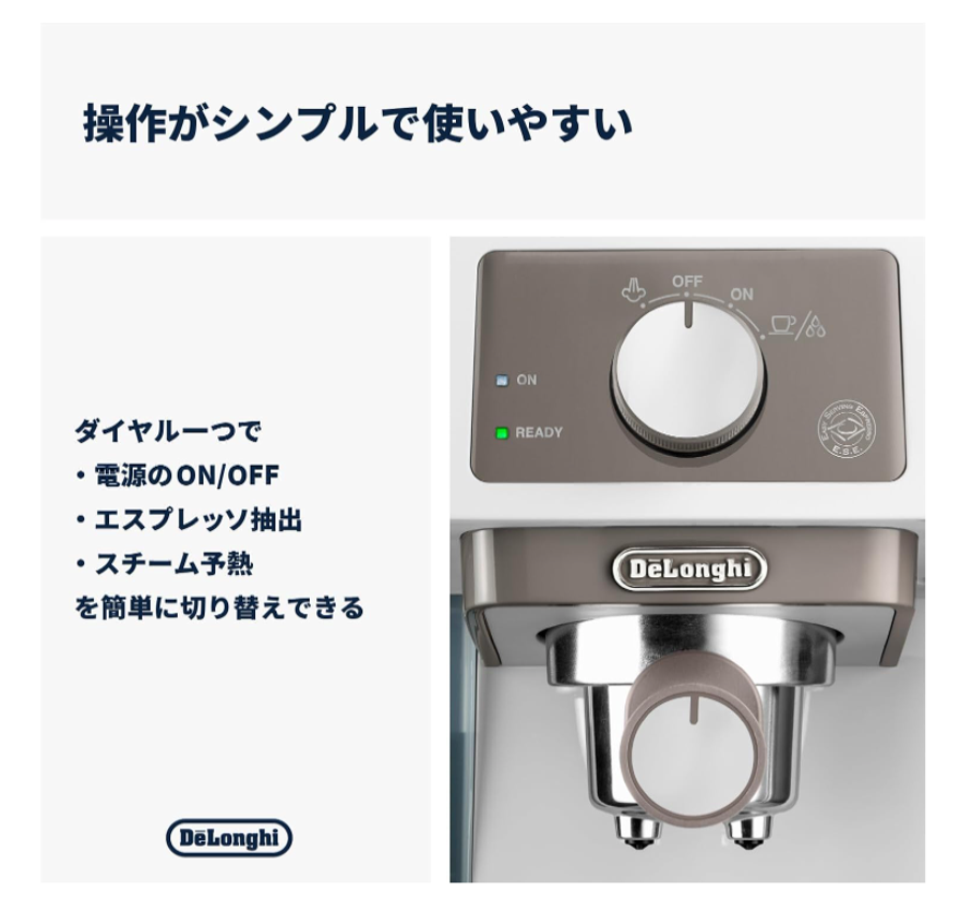 電源のON/OFF・エスプレッソ抽出・スチーム予熱の切り替えは、フロントパネルのダイヤル一つで簡単に操作可能。