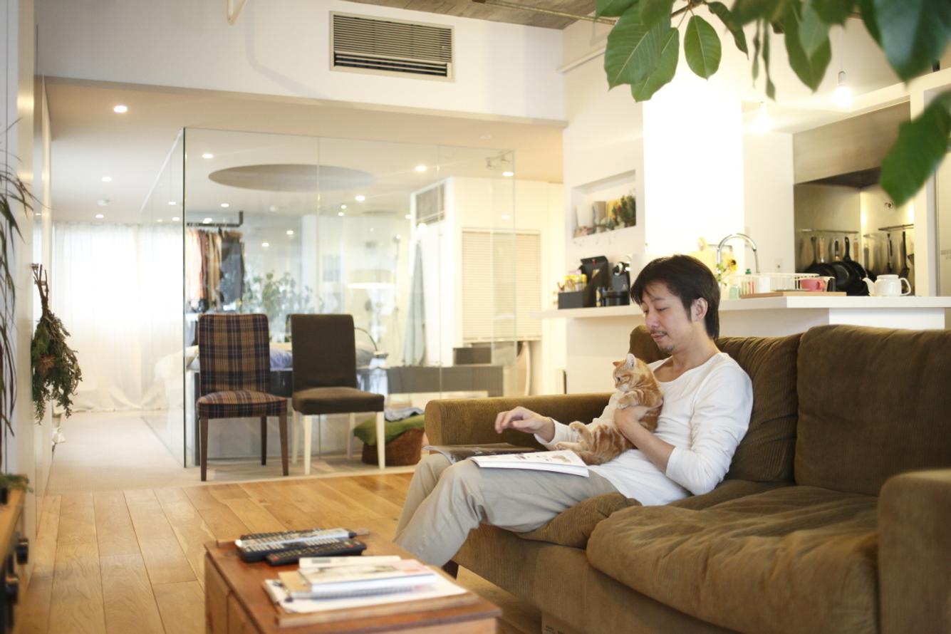 もともと2LDKだったこの部屋。まずワンルームの状態にした後、リビング・ダイニング・キッチンのオープンな空間と、ベッドルーム・水回りをガラス壁で仕切った空間に分けています。閉塞感がなく、全体が見渡せる部屋には、明るさと清潔感があります。