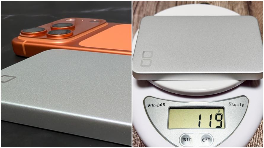 厚みは「iPhone 17 Pro」とほぼ同じ約8.7mmで、重量も実測値でわずか119g(公式サイトの情報では約121g)。iPhone 17 Proのおよそ3分の2程度の軽さです。