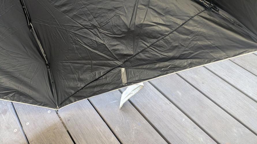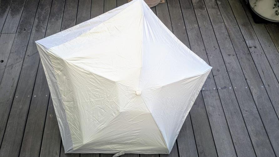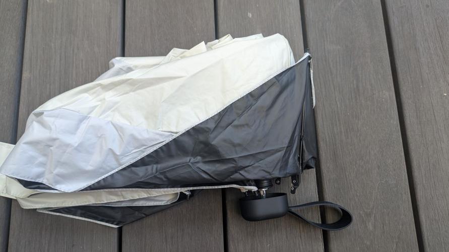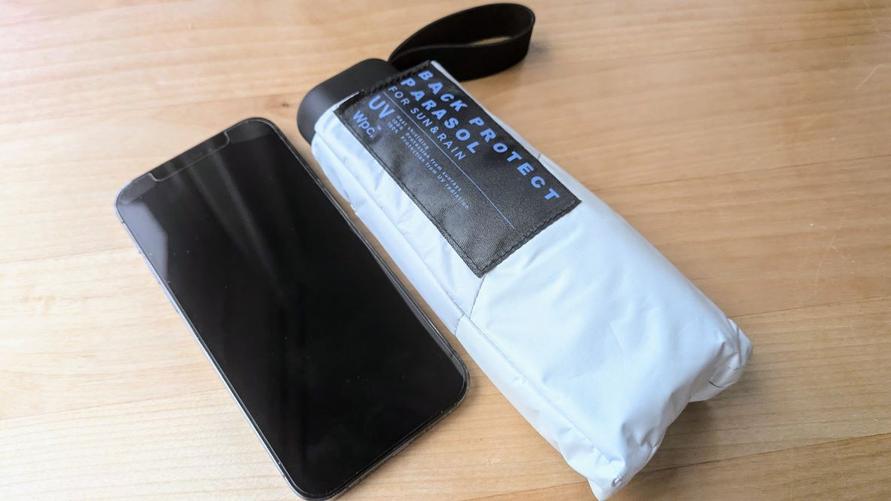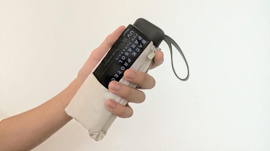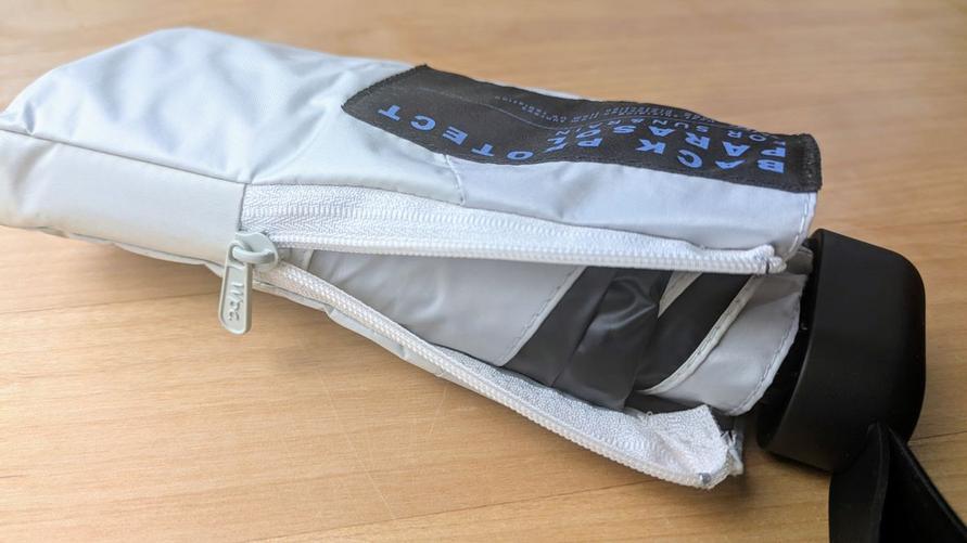 今年購入した「遮光 バックプロテクトパラソル タイニー」は晴雨兼用折りたたみ傘で、閉じている状態ではよくあるコンパクトな傘です。