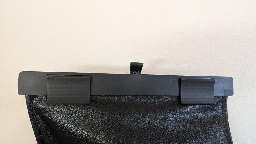 フェイクレザーのバッグのようなデザインの、吊り下げ式ゴミ箱です。