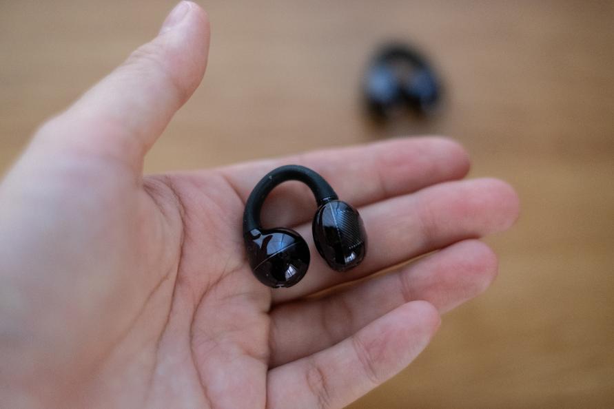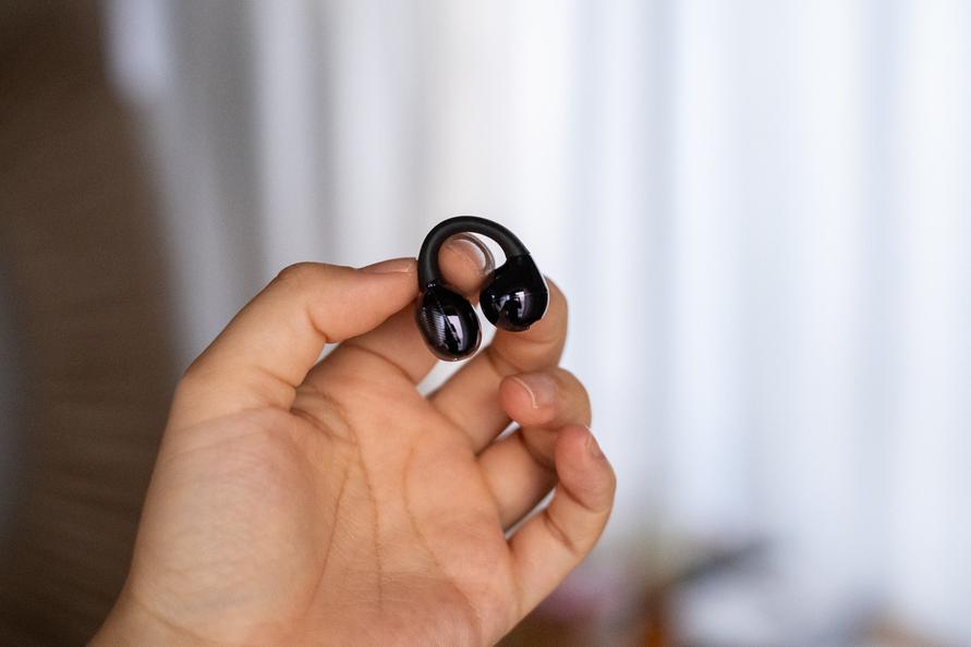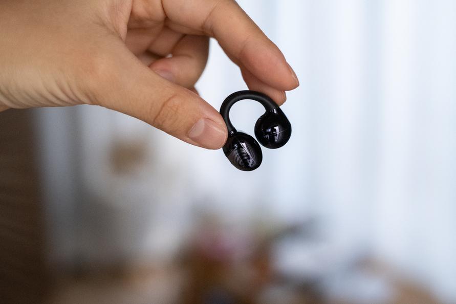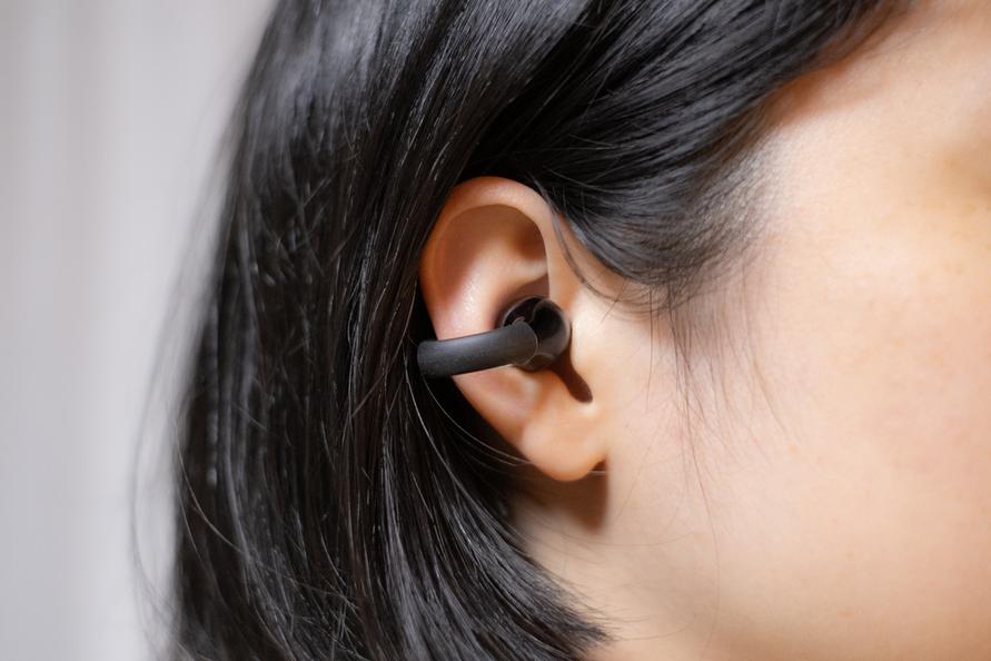 耳に挟んでつけるイヤーカフ型のオープンイヤーイヤホンです。
