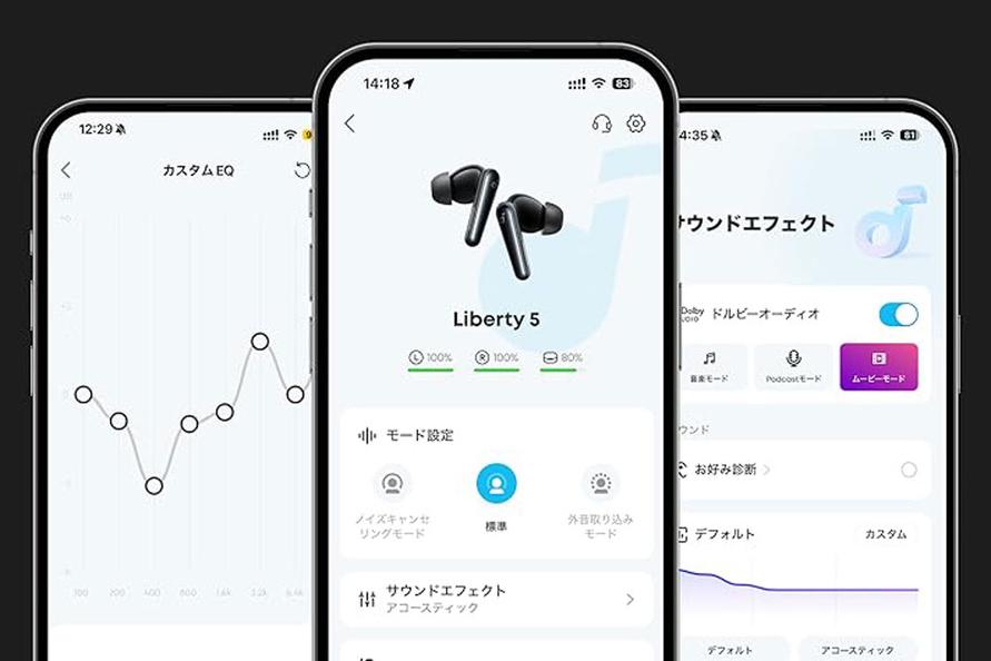 専用のSoundcoreアプリを使えば、音質を好みに調整したり、「Dolby Audio」のモードを変えたり……と、“今聴きたい音”に変更可能。