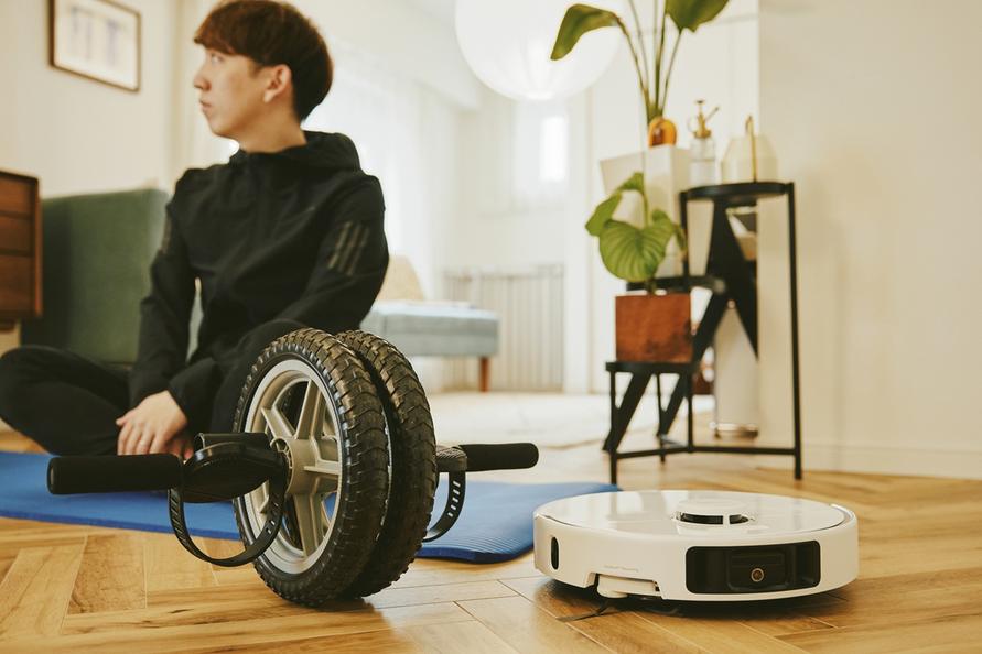 トレーニングシーンでも「MOVA P50 Ultra」は大活躍。運動の合間に部屋の掃除を任せられるのはもちろん、床に落ちてしまった汗も水拭きしてくれて、さっぱりと清潔な床をキープ!